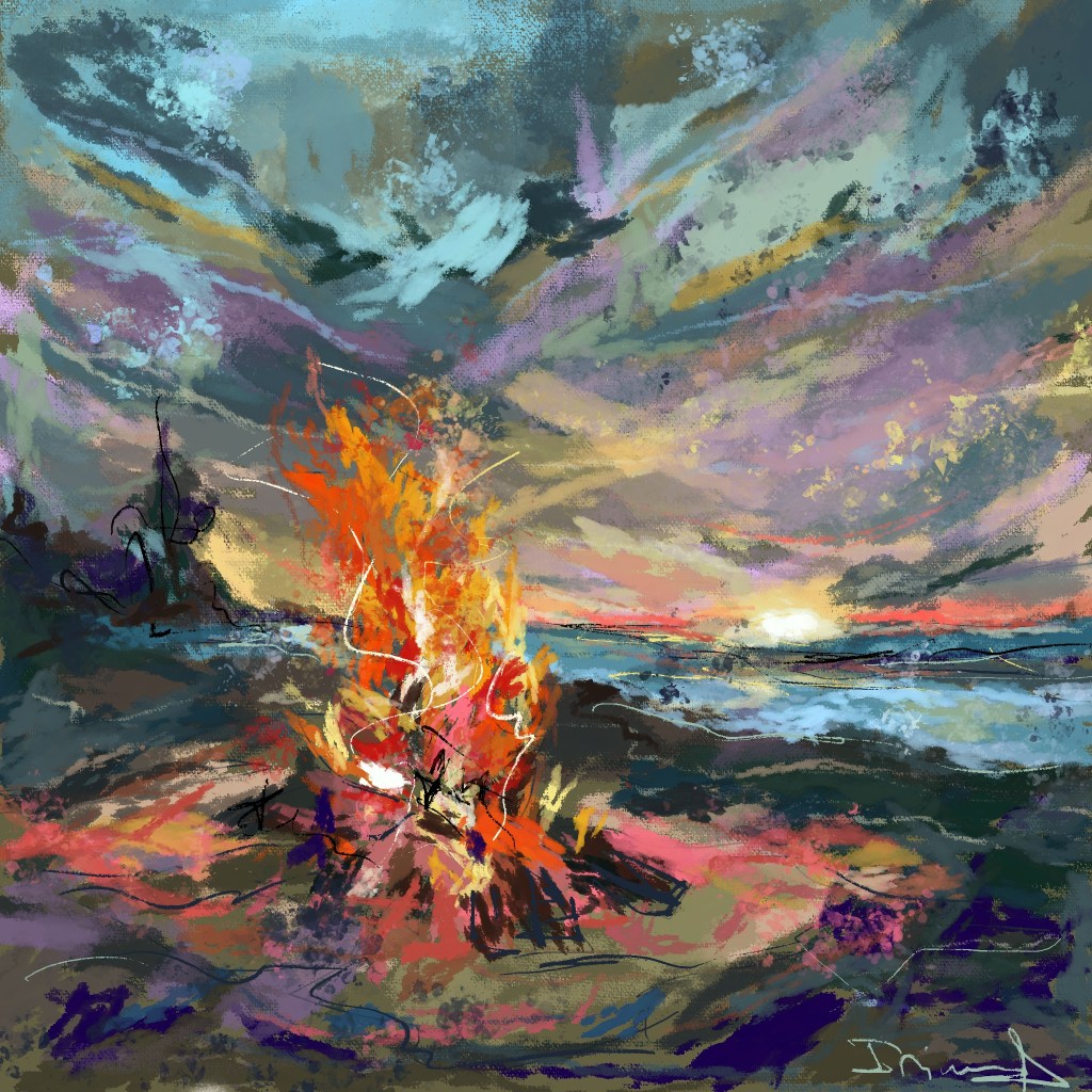 Paul’s letter to the Corinthians is the first attempt to tell what happened: Jesus appeared first to Peter, then to the Twelve, then to 500 people, then to James. That’s not what we get in the gospels! Mark is of no help, as it has no post-resurrection appearances whatsoever. In some of other gospel accounts, the timing of “day 3” seems to be important, as that’s when the women see Jesus on the way from the grave (Mt), Mary talks to “the gardener” at the grave (Jn), the disciples minus Thomas see him in the locked room (Jn), and Cleopas, maybe with his wife, see him as they head to Emmaus (Lk). Another shared element is the greeting. Mary Magdalene heard her name, the group minus Thomas and then with Thomas a week later – “peace be with you” (Jn). This phrase also appears, confusingly, in today’s reading that has the two go back from Emmaus to their friends in Jerusalem (Lk). Lastly, there is the breaking of bread – at Emmaus (Lk) and on the beach (Jn). Plus don’t forget the grilled fish! Jesus cooked (and I assume, ate) it on the beach over the fire that I tried to capture in the image above. There’s even a fish shape hidden in the sky, which I didn’t create intentionally – can you see it? And of course, Jesus just had to have a piece of broiled fish for dinner in Jerusalem in the story from Luke we read today.