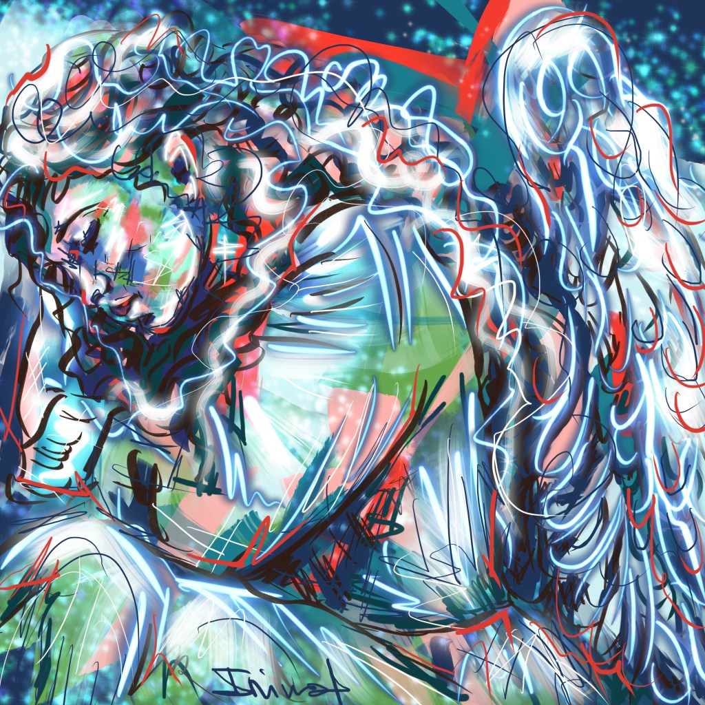 In scripture, angels often arrive hidden in the ordinariness of life, and are glimpsed only once human eyes adjust to the mystery. This drawing invites us into that same experience: the angel is present, yet veiled in colour and motion, light and line. Where do you begin to see the angel take form? In the bowed head, the arc of a wing, the radiance of light? And what does it mean that the holy is not always obvious, but discovered through attention and patience?
