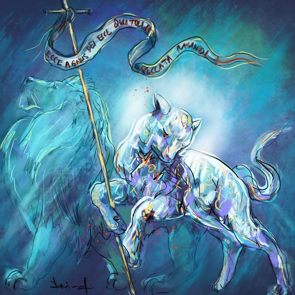 “Ecce Agnus Dei. Ecce qui tollit peccata mundi”—“Behold the Lamb of God. Behold the one who takes away the sin of the world”. Read on to find out why the lion is also present in the background.